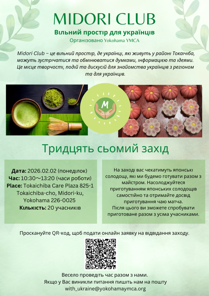Насолоджуйтеся приготуванням японських солодощів самостійно та отримайте досвід приготування чаю матча (Спеціальний чайний порошок поміщають у велику чайну миску, додають гарячу воду та суміш перемішують спеціальним інструментом, який називається часен.).