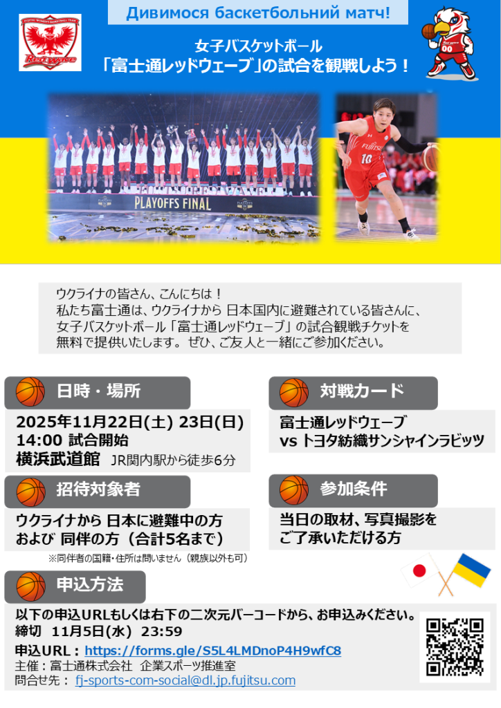 富士通レッドウェーブ(女子バスケットボールチーム)が、避難民の皆さまに観戦チケットをくださいます。